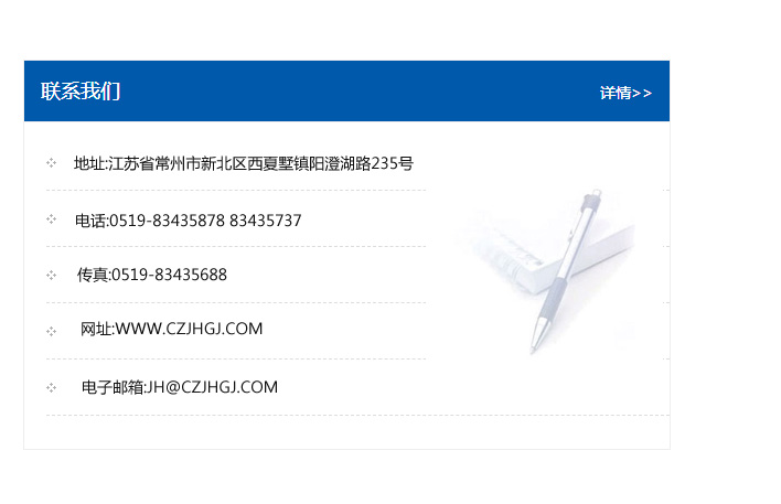 地址:常州市新北區友邦商務大廈1幢16、17層  電話:0519-85101652  傳真:0519-85112595  郵編:213022  網址:www_cz-jiayue_cn.ssbq966.com  郵箱:xiajifengaa@163.com